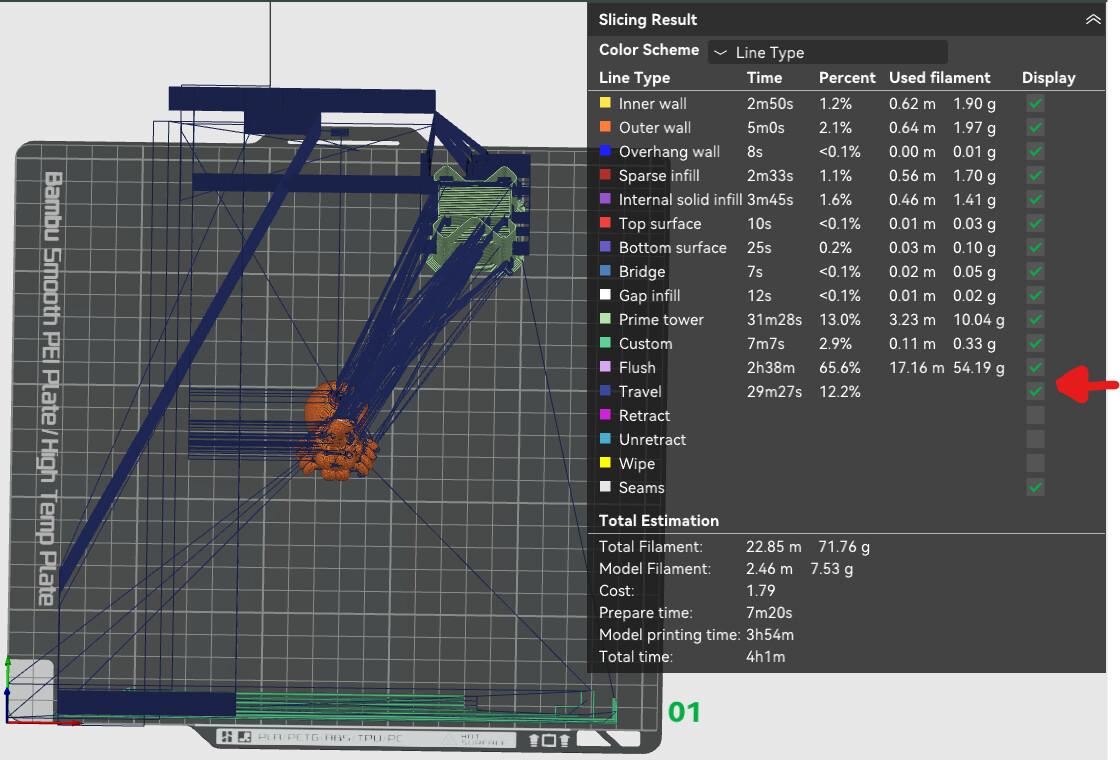 You may want to enable the visualization of the travel paths in the Line Type Preview. There’s likely one or more that exceed the allowable build volume (other than cutting and pooping).