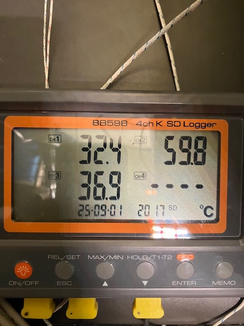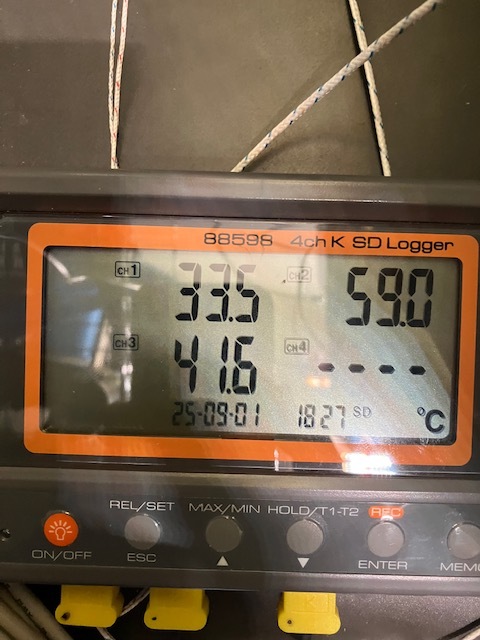 I’ll start out describing my printer layout. Fully enclosed P1S w/ AMS, thermal sensors in the top of the AMS (CH1), top center of the P1S 4” (101.6mm) (CH2) above the print bed THIS IS THE CHANNEL OF INTEREST, and one at the base of the printer (CH3) about 1” (25.4mm) off the base. I have a 2” (50.8mm) vent hose about 4FT (1.2M) long with a variable powered blower running out the window and a window Air Conditioner right next to the printer.