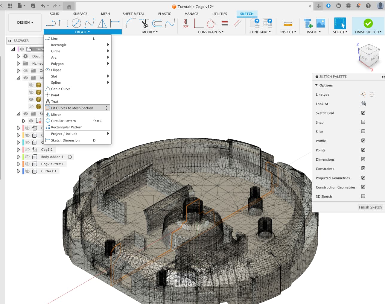 - That creates you a sketch - but it isn’t awfully usable - to make it usable - I found that within the sketch you need to create usable curves by using ‘fit curves to mesh section’ -