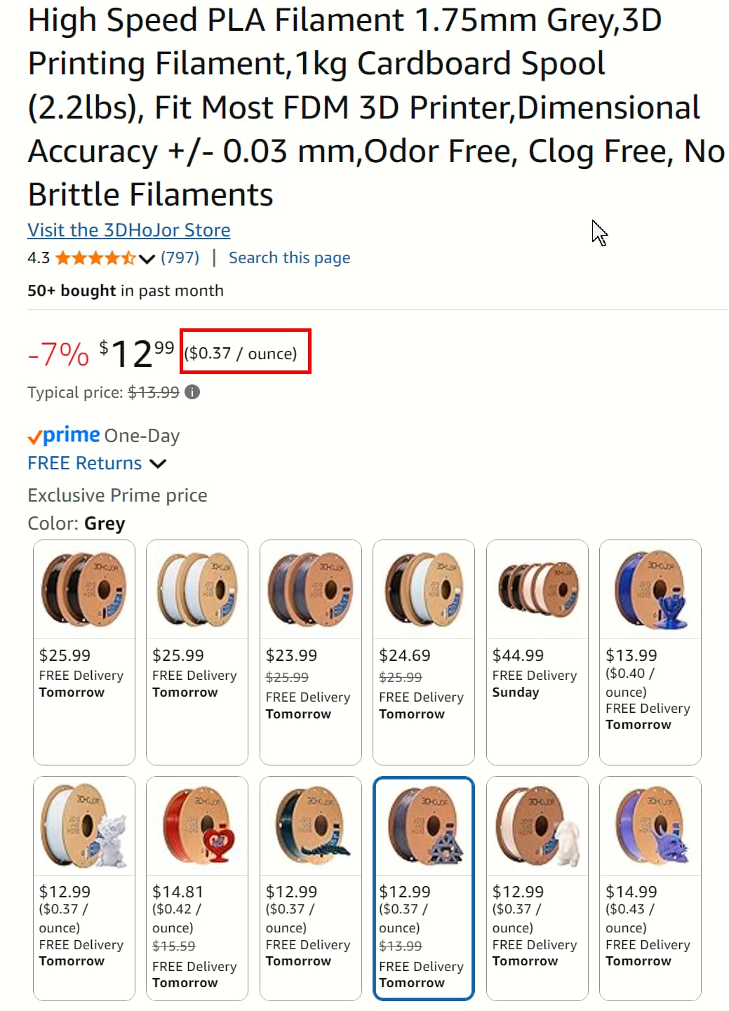 Amazon currently lists the typical price of 3DHoJor as $14/Kg which is the same price Bambu offers if you get at least 6 spools at once(their 2nd level of bulk pricing).(note: it takes 7 spools to get the free shipping from Bambu)