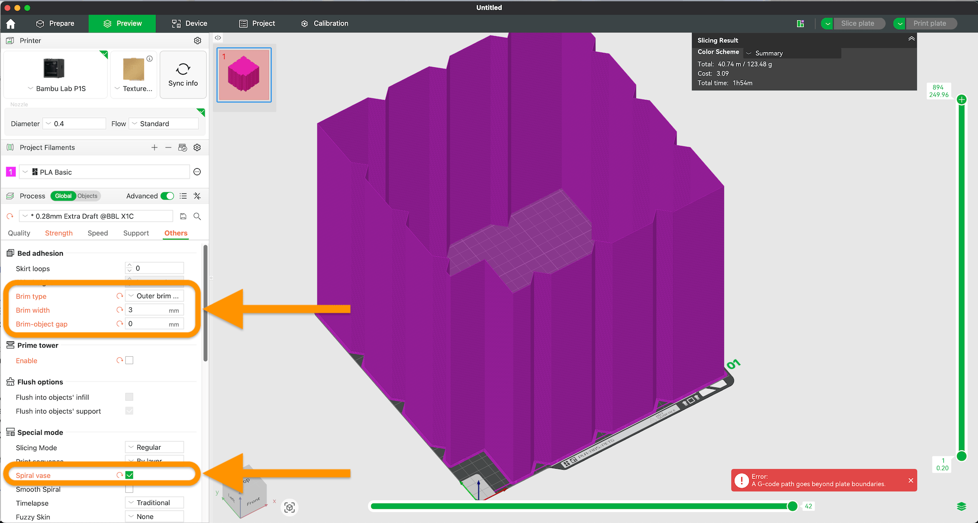 bring into Bambu Studio, enable vase mode, set bottom shell layers to 0 (in the Strength tab, not shown here), and add a small brim to keep it in place: