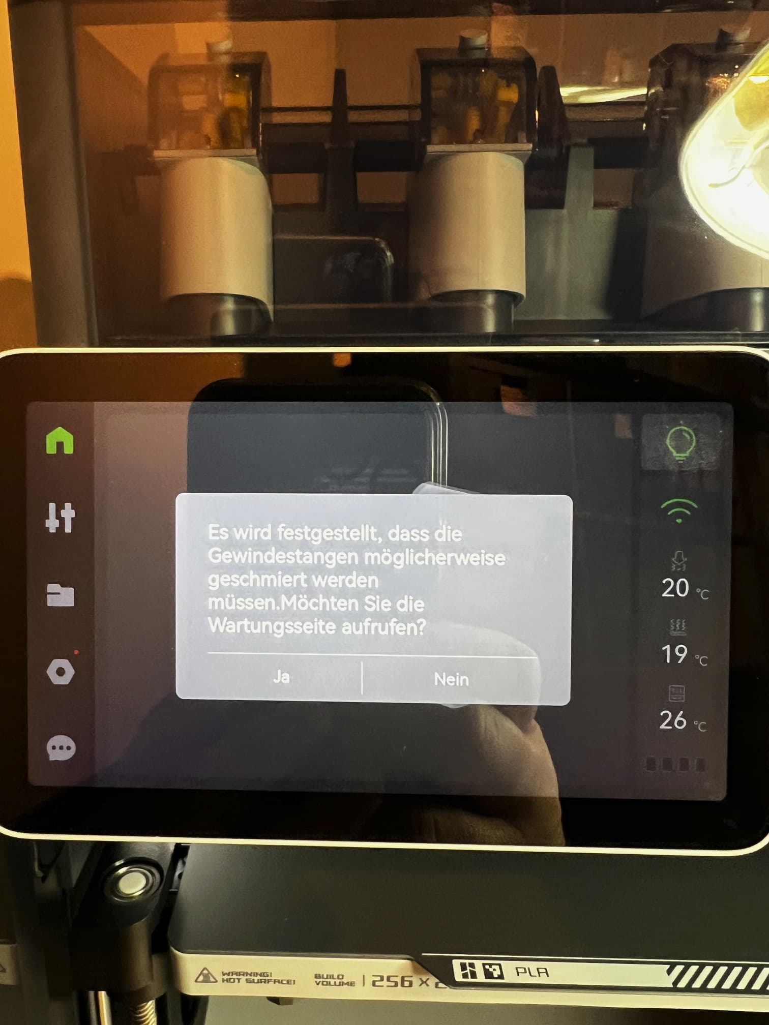 ich habe gerade meinen X1c ausgepackt. Nach dem fw update und der initialen Kalibrierung finde ich in den Einstellungen den Hinweis, dass die Gewindestangen möglicherweise geschmiert werden sollten.