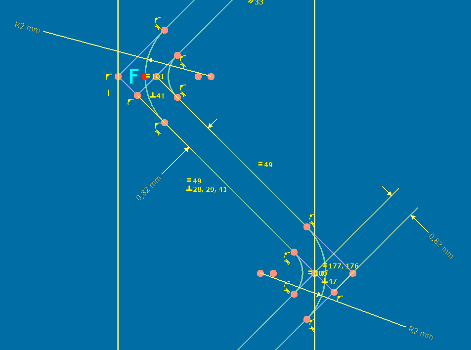 Strength 0.2mm. Angle of the folds 45°. Wall thickness 0.82mm in straight parts, 0.7mm in chamfered parts (F in picture; to make the bellows less stiff).