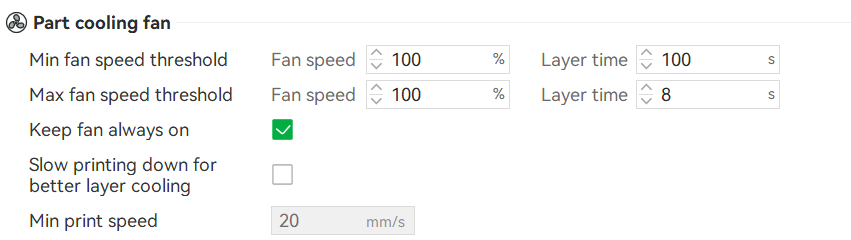Uncheck “Slow printing down for better layer cooling” and put your part on the bed just front of the auxiliary fan at 100%, otherwise you may have cooling problem on layers with few lines which are printed fast.